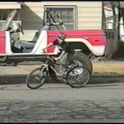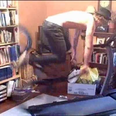 Teen boy rides a bike on a treadmill. He falls and hits his face on the treadmill. Bonehead.