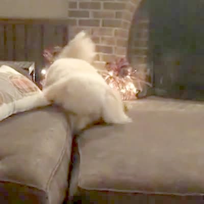 A poodle dog tries to retrieve a ball stuck in the crease of a couch in a living room. She repeatedly jumps up and gets her face stuck in the crease of the couch.
