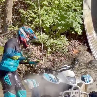 A teen girl rides an ATV through a water tube channel and nose dives out of the other end.