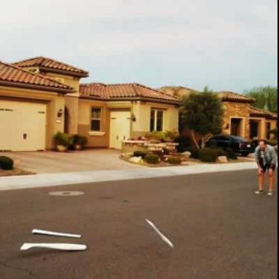 A man throws a styrofoam airplane that nose dives into the ground and falls apart.