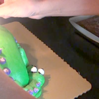 Woman drops boy's dinosaur-shaped birthday cake on kitchen floor when she's getting ready to carry it into the dining room. Party.