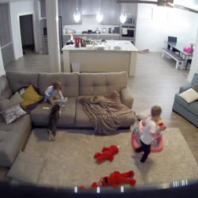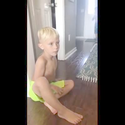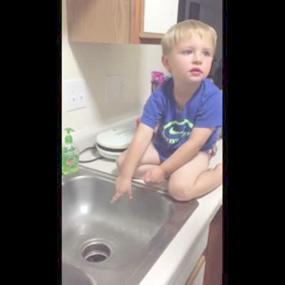 A tot boy thinks his stuffed animal toy went down the drain for the kitchen sink and yells into the drain to call it back. Then he says that he will go down the drain and bring the toy back. Right as the boy gets ready to go down the drain at 2:15, his dad lifts him up to show him that the toy is on top of the cupboard.