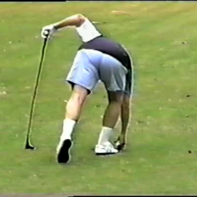 Man approaches teed golf ball, gets ready, and another ball from off camera flies in and hits his ball. Guy is surprised.