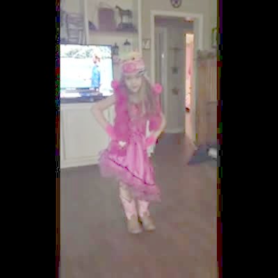A young girl stands in the living room in a costume and says she is ready for pictures. A pig walks across in front of her.
