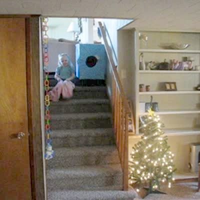 Tot girl stands on stairs and says "cheese" to the camera. Her brother is in a box behind her getting ready to slide down the stairs. She moves into his path and is catapulted down the stairs. Siblings.