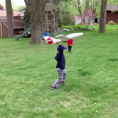 A boy runs with a large Styrofoam model airplane and gets ready to throw it but throws it to the ground where it breaks.