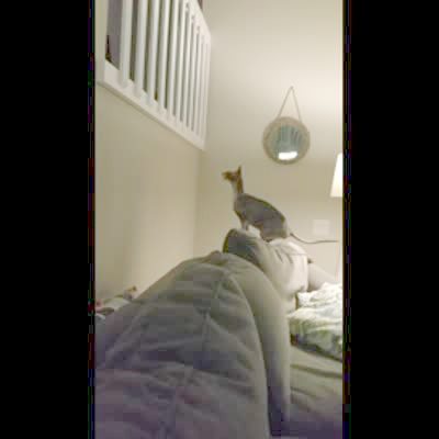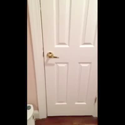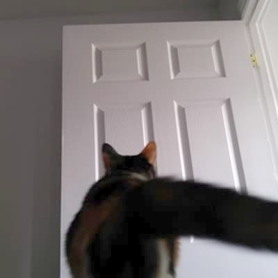 A cat readies herself to jump to the top of a door, but when she jumps, she only makes it halfway.