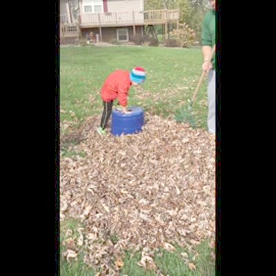 A young boy jumps off a bucket into a leaf pile in the yard. His twin brother climbs on next, and the bucket breaks right as he gets ready to jump and he falls in it and then falls down into the leaf pile.