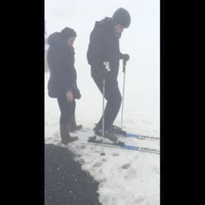 A man skis for the first time and yells when his sister pushes him to move before he is ready outdoors.