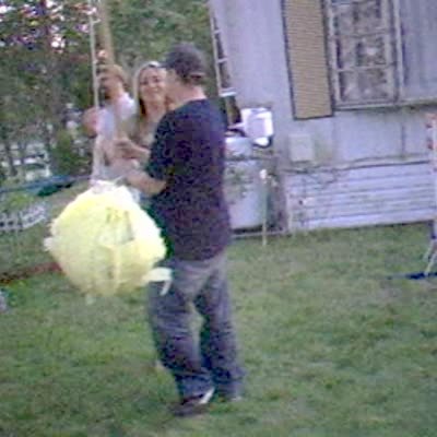 Teen girl stands behind man helping him get ready to hit pinata. He misses the pinata, hits the teen girl hard in the head with the stick. BBQ, party. Short tails.
