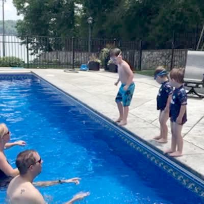 Three young boys stand at the edge of a pool and get ready to jump in when their parents count to three. Two of the boys jump in and the third one trips and falls into the water.