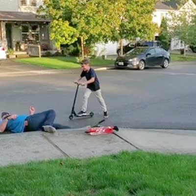 A man falls in the street when he tries to jump a scooter onto the curb and his young son says, "I told you you're not ready."