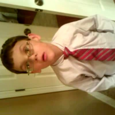 Young boy wears a dress shirt and a clip-on tie getting ready for a birthday party. He turns around & you see the shirt is on backwards, the collar is in the back.