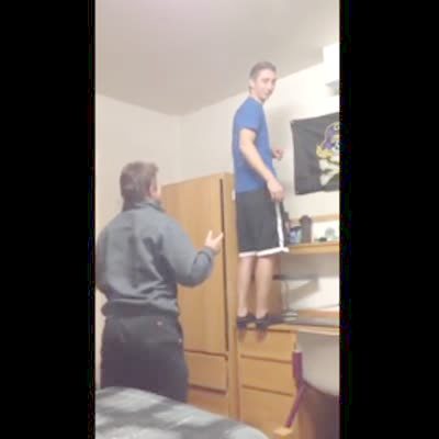 A teen boy does a trust fall off of a dresser and his friend isn't ready but still catches him.
