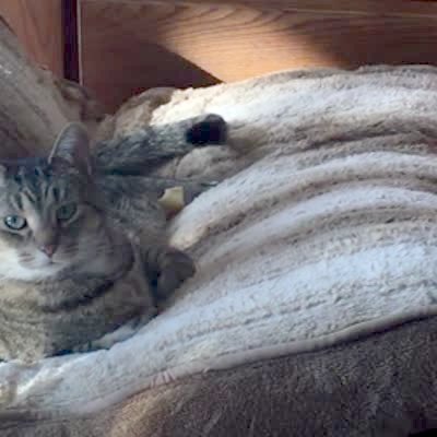 Bulldog hides under a cat bed and jumps out when found. Cat sits there as if nothing is wrong.