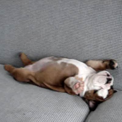 Tiny bulldog puppy is lying on its back asleep on the couch. Woman gently tries to wake the dog but it doesn't get up. Dog just stretches a bit. Nothing happens, just a cute visual. sleeping sleep