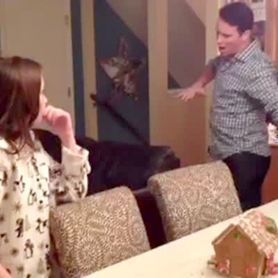 A man tries to karate chop a ginger bread house at home before the family eats it. He smacks it and nothing happens.