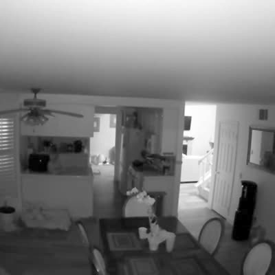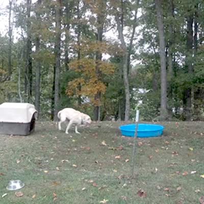 A man leads a small dog out of the house, but he walks headfirst into a sliding glass door. A woman off-camera asks the man if he just walked into the door, and he says that nothing happened. Security footage.