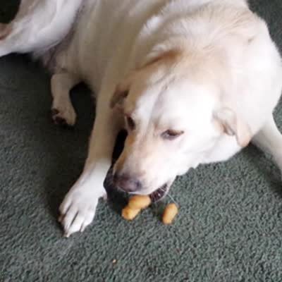"Tater Tot Taker" A guilty looking dog tries to act like there is nothing in his mouth when his owner asks him, and then he dumps out nine tater tots that were in there indoors.