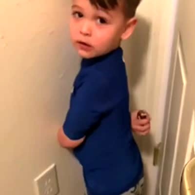 A woman finds her tot boy as he eats candy behind the door of his bedroom. She asks him what he's up to and he shouts nothing as he hides the candy behind his back, but he turns his body and his mom can see it.