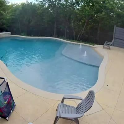 A man talks on the phone alongside a swimming pool, and he missteps and falls onto the step and acts like nothing happened.