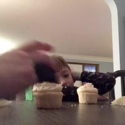 A family does a gender reveal with their two tot boys at the kitchen table. They bite into their cupcakes but don't find any pink or blue coloring on the inside, and the mother says "there's nothing in my cupcake."