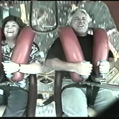 Man & woman ride slingshot ride at amusement park. As soon as it takes off, man screams "this was so stupid, I want off now." Man screams like a girl. Woman teases him.