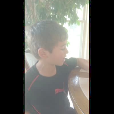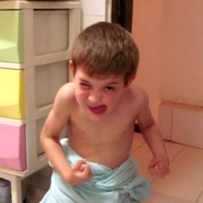 A young boy flexes his muscles in a bathroom and makes a funny face and says "take picture now, you'll miss my muscles" and a man laughs and tells him it's a video and the boy makes a surprised face and says "What?" Animotica video.
