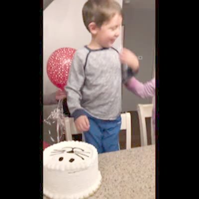 "His Face Takes the Cake" - A young boy smashes his own face into his birthday cake. The cake has a cat on it. When he lifts up his head the whiskers are now on his face.