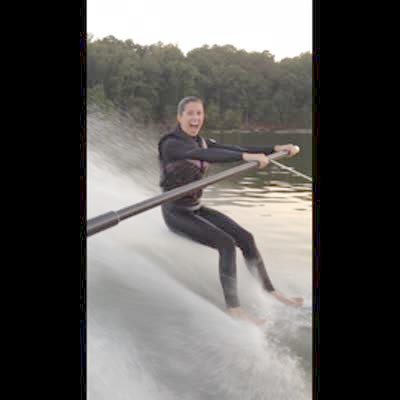 A woman barefoot water skis on the side of a boat outdoors. She asks "now what?" and falls on her face.