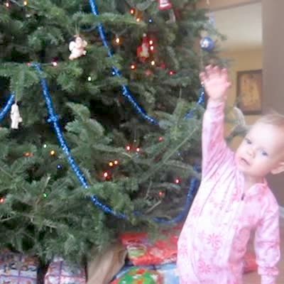 Tot girl is in front of the Christmas tree while mom sings "Jingle Bells." She stops singing to poop in her diaper. Mom asks if she's going right now & girl says "yes."