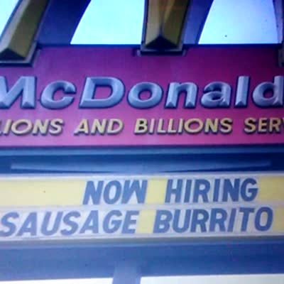 Funny sign: A McDonalds sign reads: now hiring one sausage burrito.