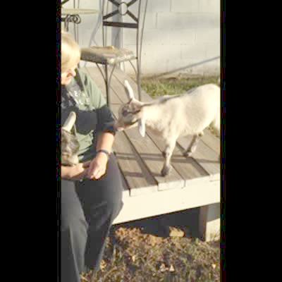 A woman gives a baby goat a belly rub in the yard. When she stops, it starts to headbutt her until she does it again. Then another baby goat approaches her and pushes the first goat away so that she can start to give it belly rubs now.