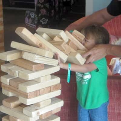 A young boy pulls out a block in a large-sized Jenga block tower indoors and the tower starts to fall, hitting the boy in the face. He stands with the blocks against his face and his eyes shift as he's not sure what to do now. His dad helps him and picks him up as the boy holds his hands against his face.