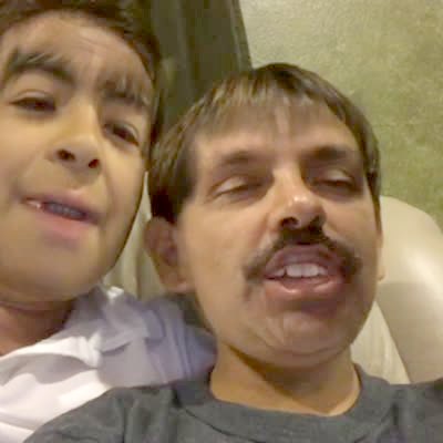 A man and a boy do a face swap in the living room and the boy talks about how he has a mustache now. Snapchat.