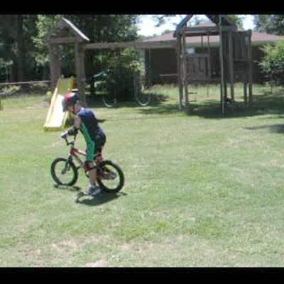A young boy says, "I can do it now," as he rides his bicycle straight into a pole.