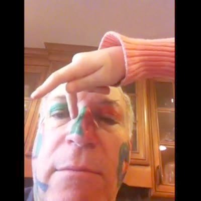 A young girl points at her grandpas face after she painted him. She points out a candy cane and a welcome sign she drew. He says he's all ready for Christmas now.