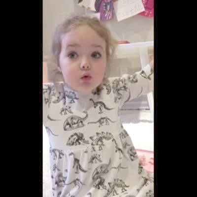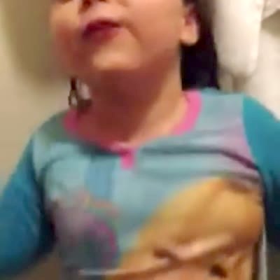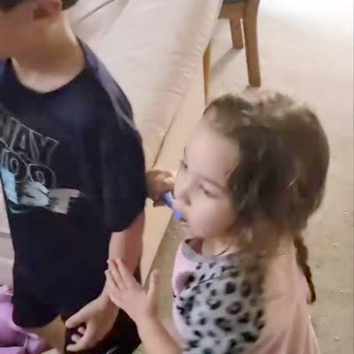 A young boy and a tot girl stand in a living room and brush their teeth to a song about brushing teeth. The song says, "Now spit." The tot girl spits in the living room into the face of a woman who lies on the floor.