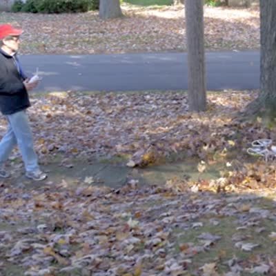 A man pilots a remote controlled drone outdoors, using it the blow leaves off of a sidewalk. And now a moment with.