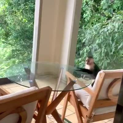 A rhesus monkey pushes a table with a glass top back and forth until the glass top falls and shatters, then the monkey leaves out the window and a young boy says "Call them now" in a sitting room.