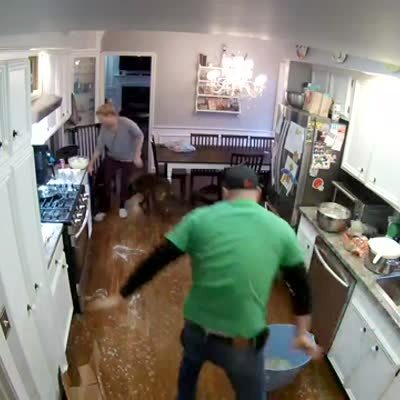 A man tries to open a brine bag for a turkey, and the bag breaks then spills all over the kitchen floor. A woman sees the mess and says "I don't even know what to do right now." Security footage.