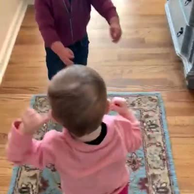 A tot boy cries and gets scared as his tot girl cousin walks toward him and his mom says the girl can walk now in a living room.