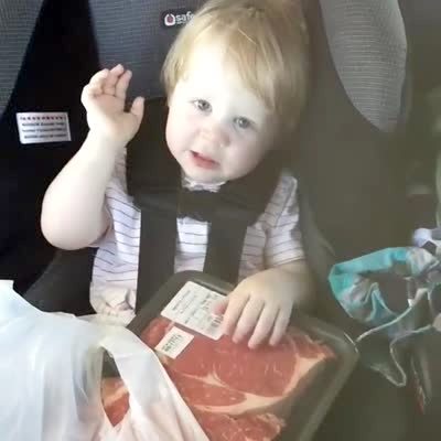 A tot boy sits in a car seat holding a package of steak. He smacks it over and over and says, "pizza now!"
