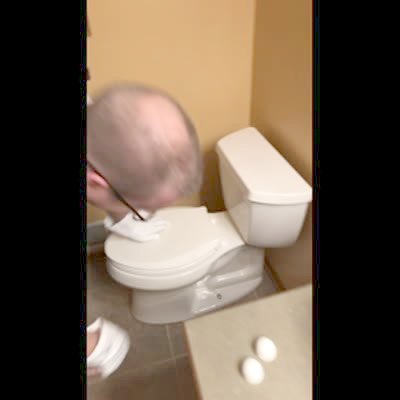 A man drops his electric razor in the toilet as it flushes and the razor is now stuck inside as it makes a loud buzz noise.