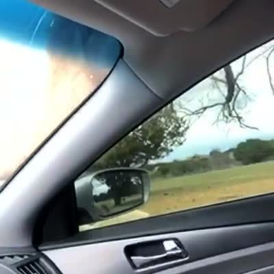 A young boy says "who's scared of the camel now?", then the car window rolls down and he screams at the camel at a drive thru safari park.