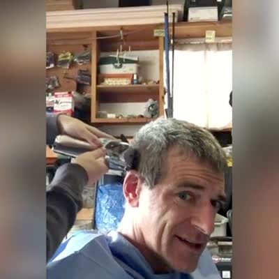 A young boy gives a senior man a haircut. The man notices that the clippers fell off and the boy has left him with a few bald spots. He tells the boy they need to get mommy now.