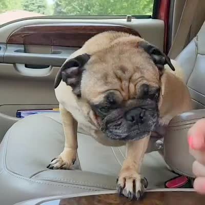 A woman repeats, "we're not going for a ride right now," as her large dog struggles to crawl up into a vehicle while another refuses to get out of the front seat. It then cuts back to the defeated woman at the end as she looks at the camera and says, "we're going for a ride."