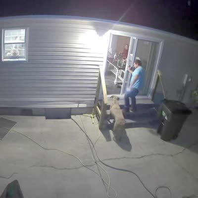 A dog walks into a sliding glass door. It then takes a long time before it enters the now open doorway. Security camera footage.