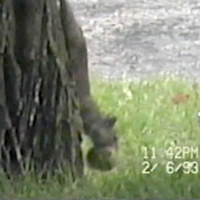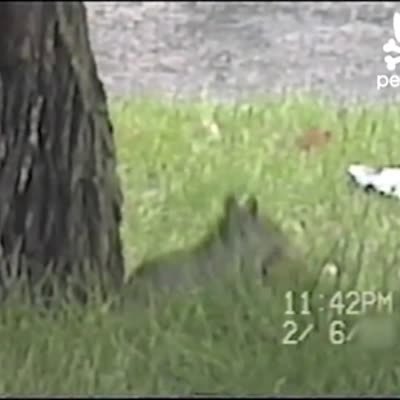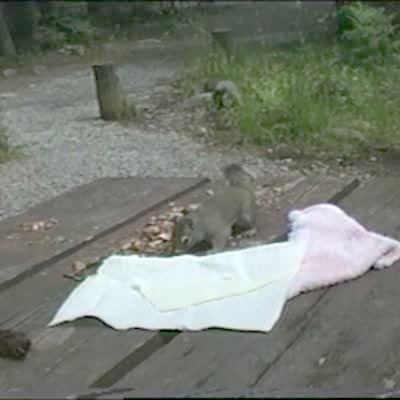 Squirrel chases a peanut tied to a fishing line being reeled in by man off-camera. Squirrel grabs nut & gets lifted into the air.