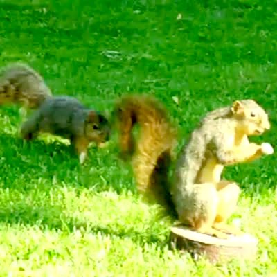 Squirrel eats nuts in front of a dog & the dog doesn't move. Dog doesn't even try to chase the squirrel.